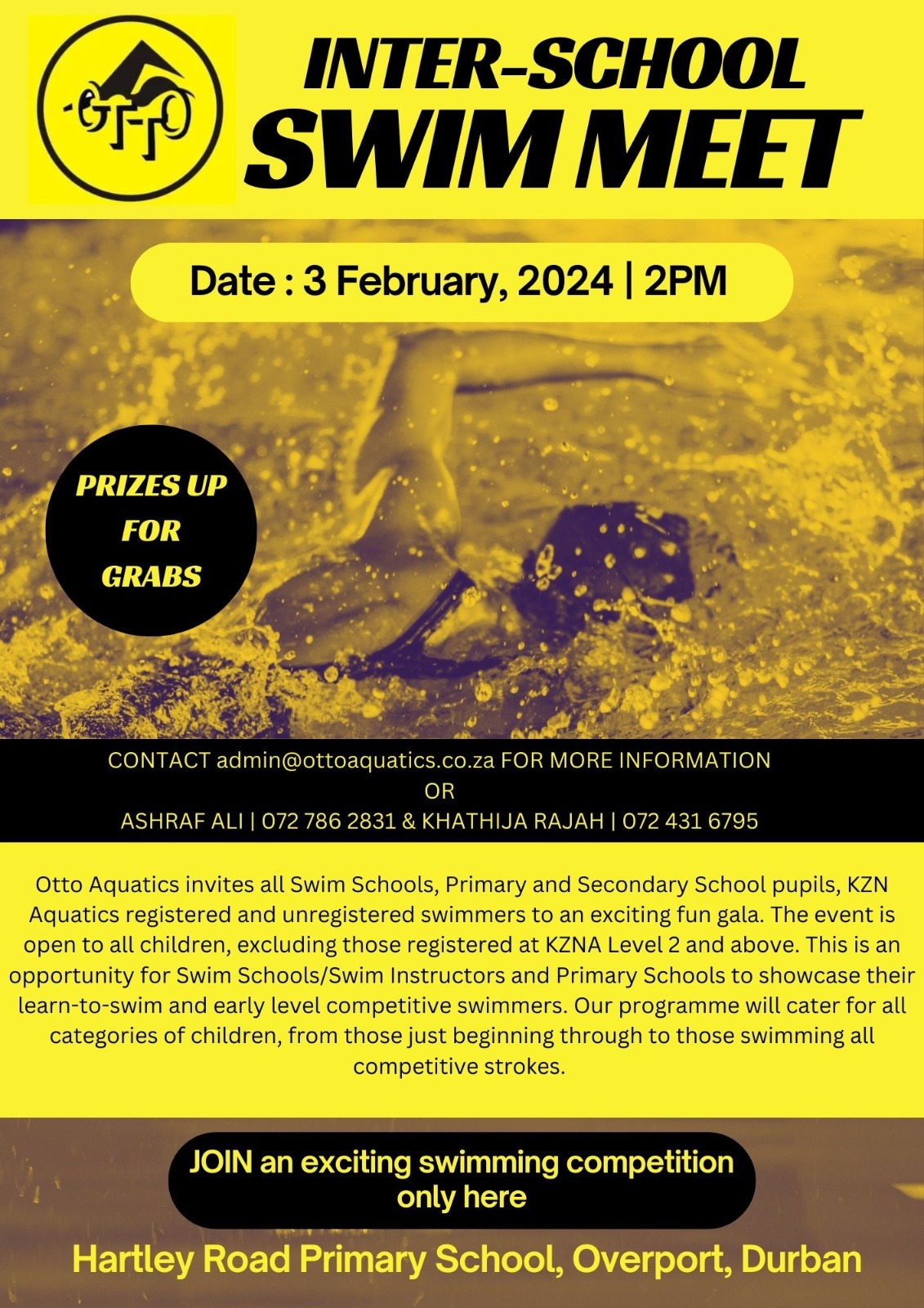 High up on the agenda is our Annual Inter-School Gala, back from a three year break, schedued for 3 February 2024 at the Hartley Road Primary School in Overport, our new training base. See the invitation and programme at the bottom of this page