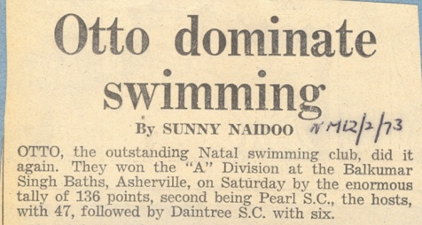 Few can now recollect why the name of "Otto" was chosen, but it was shortly to become a household name in the sporting fraternity in Asherville, and in the aquatic fraternity nationally. By the mid sixties, a few years after its launch, Otto had grown into one of the strongest clubs in Natal. Names such as Param Naidoo (the current Natal coach); the Kisten family and the Jithoo family became synonymous with both Otto and swimming in Natal. By the late sixties and early seventies, Otto had grown into the strongest club in the country. Under the chairpersonships of Morgan Naidoo, Dhama Nair, under the guidance of Vasi Nair, groomed by coaches such as Param Naidoo, the club formed the backbone of swimming in the province and had come to symbolise non racial swimming in South Africa.