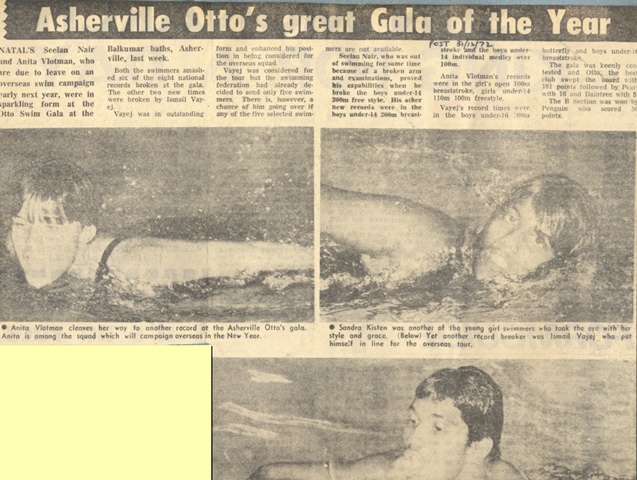 Natal, with Otto swimmers making up in excess of 80% of every squad, conquered all comers at every National Championships from 1966 to 1981 (except 1967 and 1980). The club was filled to capacity with swimmers that would have made most international teams proud. Seelan Nair and sister Dhivia, cousin Shireen, the Vayej brothers, Ismail and Ahmedy, Anita and brother Deon Vlotman, Ansari Adam, Venitha Jithoo, Alimarge Cavernelis, Annisvery and brother Cyril Kisten, Leeboy Bisset, Virend Singh, Saras Moodley, and a forever list of many others made the club great. A cursory look at the National Championships log tables, clearly show that Otto, as a club could have taken on any province in the country and still come out tops: